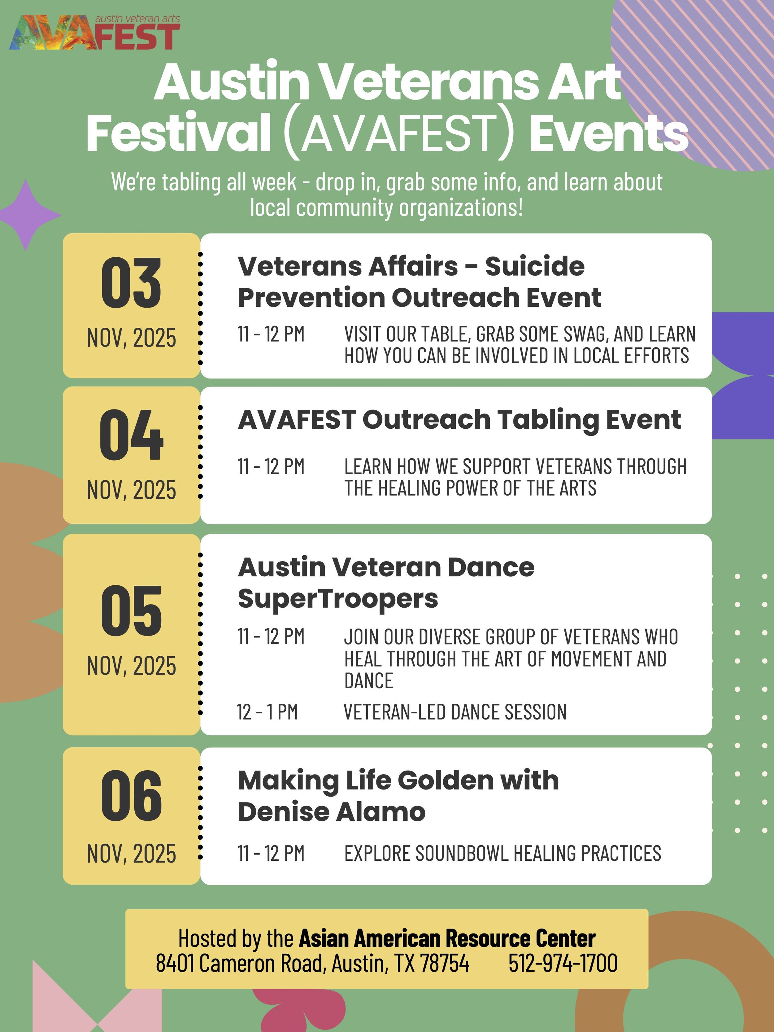 NOVEMBER 4, 2025: 11-12pm AVAFEST Outreach Tabling Event LEARN HOW WE SUPPORT VETERANS THROUGH THE HEALING POWER OF THE ARTS